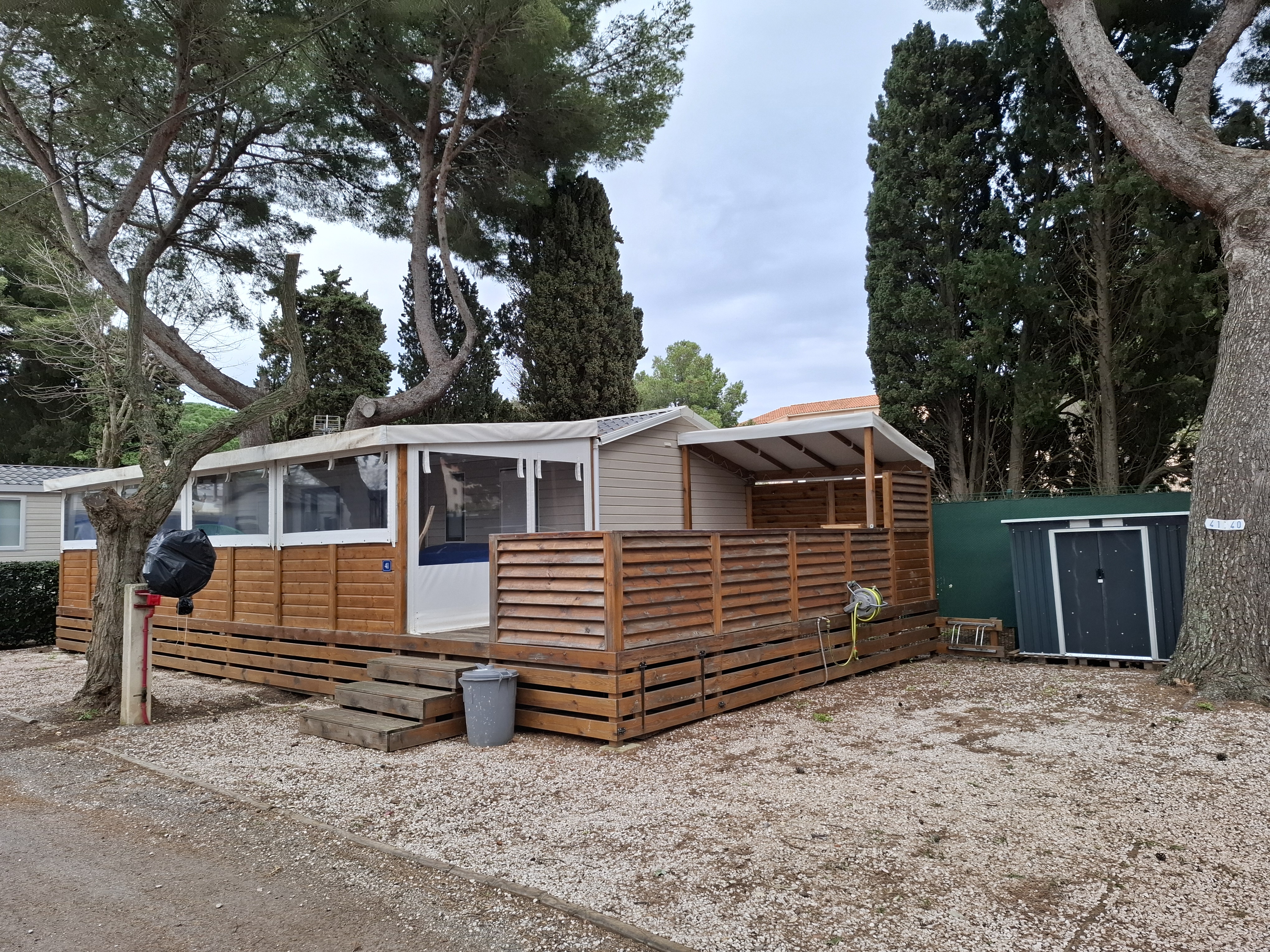 A vendre MH Nautilhome 3ch2sb de 2017 11mx4m sur parcelle de 200m2, climatisation, LL,LV,SL,3TV,avec terrasse de 11mx3m entièrement fermée et aménagée avec cuisine d'été (plaque induction,frigo,micro-onde et four, plus solarium de 3mx3m. Disponible le 15 septembre 2025. Voir conditions avec la direction.