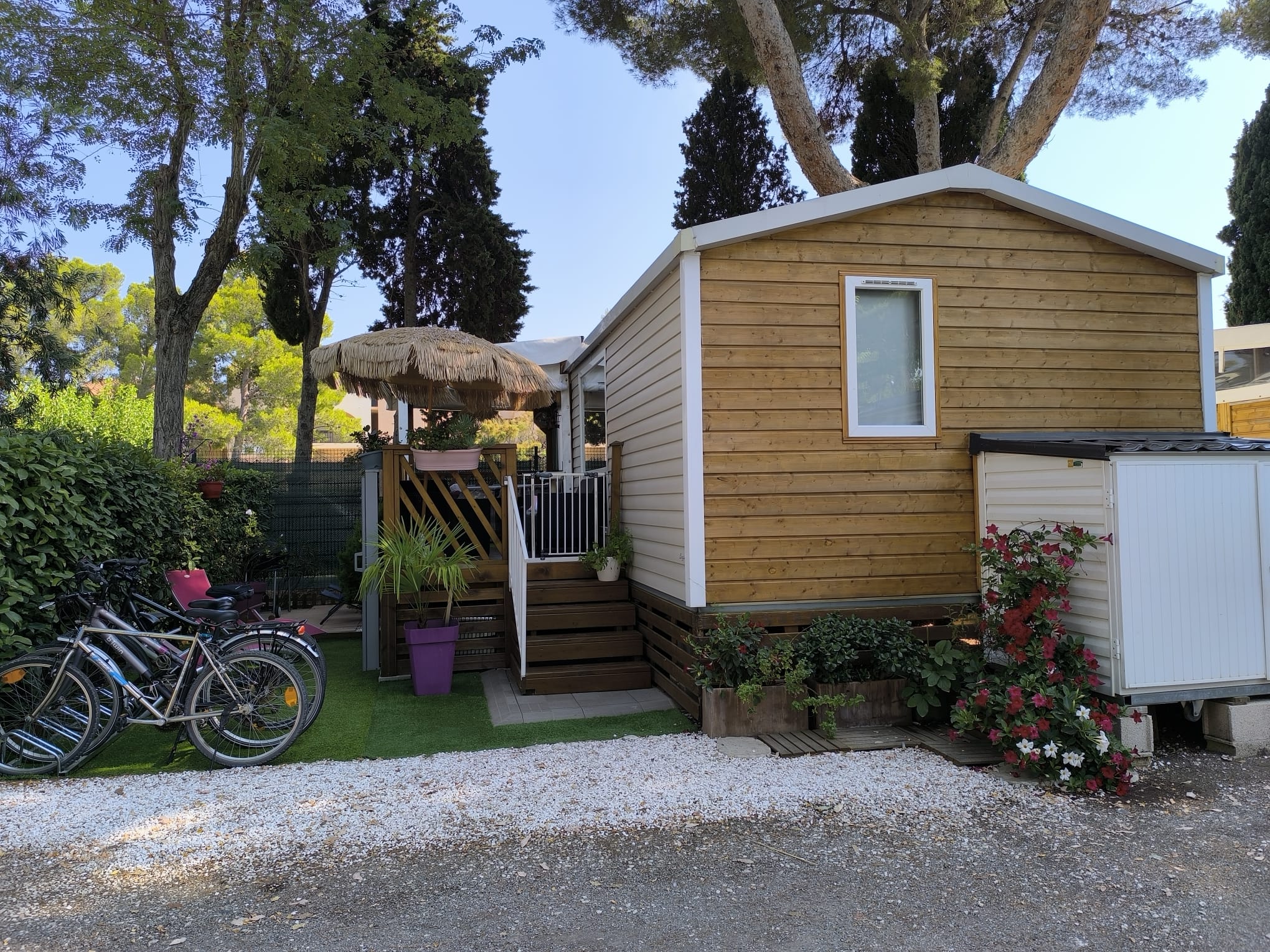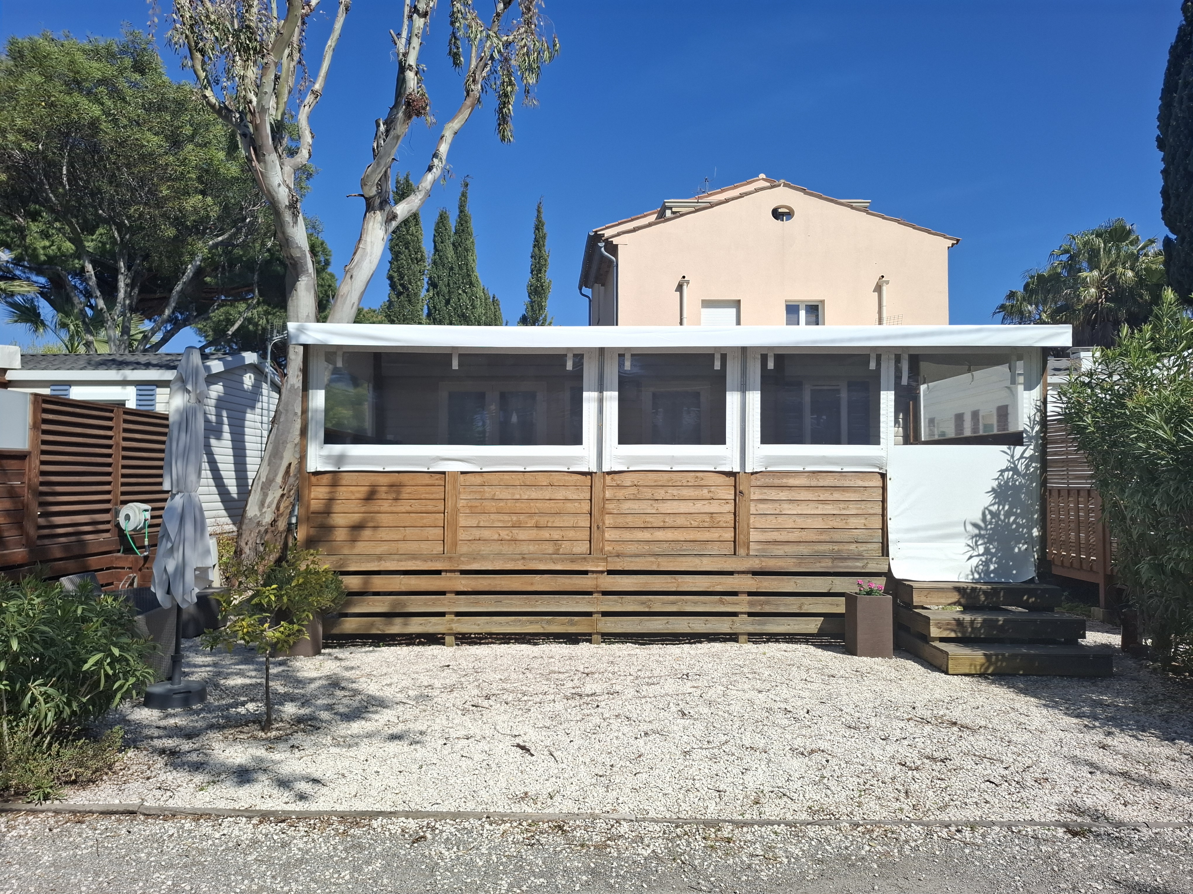 A vendre MH Nautilhome 3ch2sb de 2017 11mx4m sur parcelle de 200m2, climatisation, LL,LV,SL,3TV,avec terrasse de 11mx3m entièrement fermée et aménagée avec cuisine d'été (plaque induction,frigo,micro-onde et four, plus solarium de 3mx3m. Disponible le 15 septembre 2025. Voir conditions avec la direction.